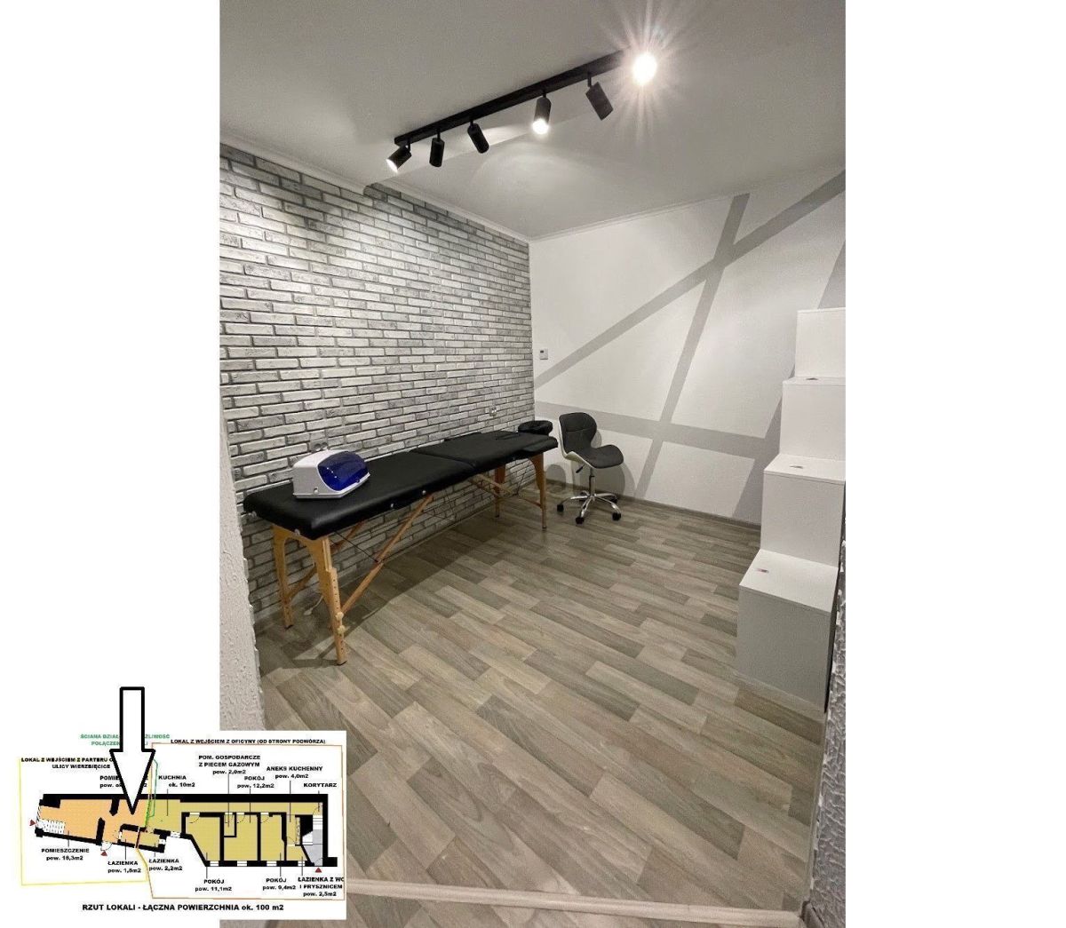 - składa się z dwóch pomieszczeń oraz łazienki, na chwilę obecną wynajęty na działalność kosmetyczną.
